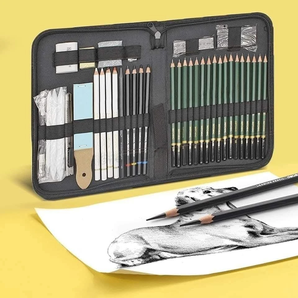 Keep Smiling Professional Sketching Kit Sketch And Drawing Pencils Set For Artist 42 Pieces 17PCs Pencils: Fx1PSBx2PCS / Bx1PC / 2Hx2Pcs / 4Hx1PC / 6Hx1PC / Hbx1pc / 2Bx2PCS / 4Bx2PCS / 6Bx2PCS / 8Bx 2PCS / 10Bx1PC / 12Bx1PC. 6B Woodless graphite 1PC. Soft Charcoal Pencil 2PCS. Medium charcoal Pencil 1PC. Hard charcoal pencil 1PC. White charcoal pencil 1PC. Brow charcoal pencil 1PC. Coffee charcoal pencil 1PC. Erase pen 1P. Sandpaper tool 1PC. Art Knife 1PC. Paper stumper 3PCS. Pencil extender 1PC. Compressed graphite 3PCS. Compressed charcoal 3PCS. Pencil sharpener. Eraser 2PCS. Kneadable eraser 1PC.