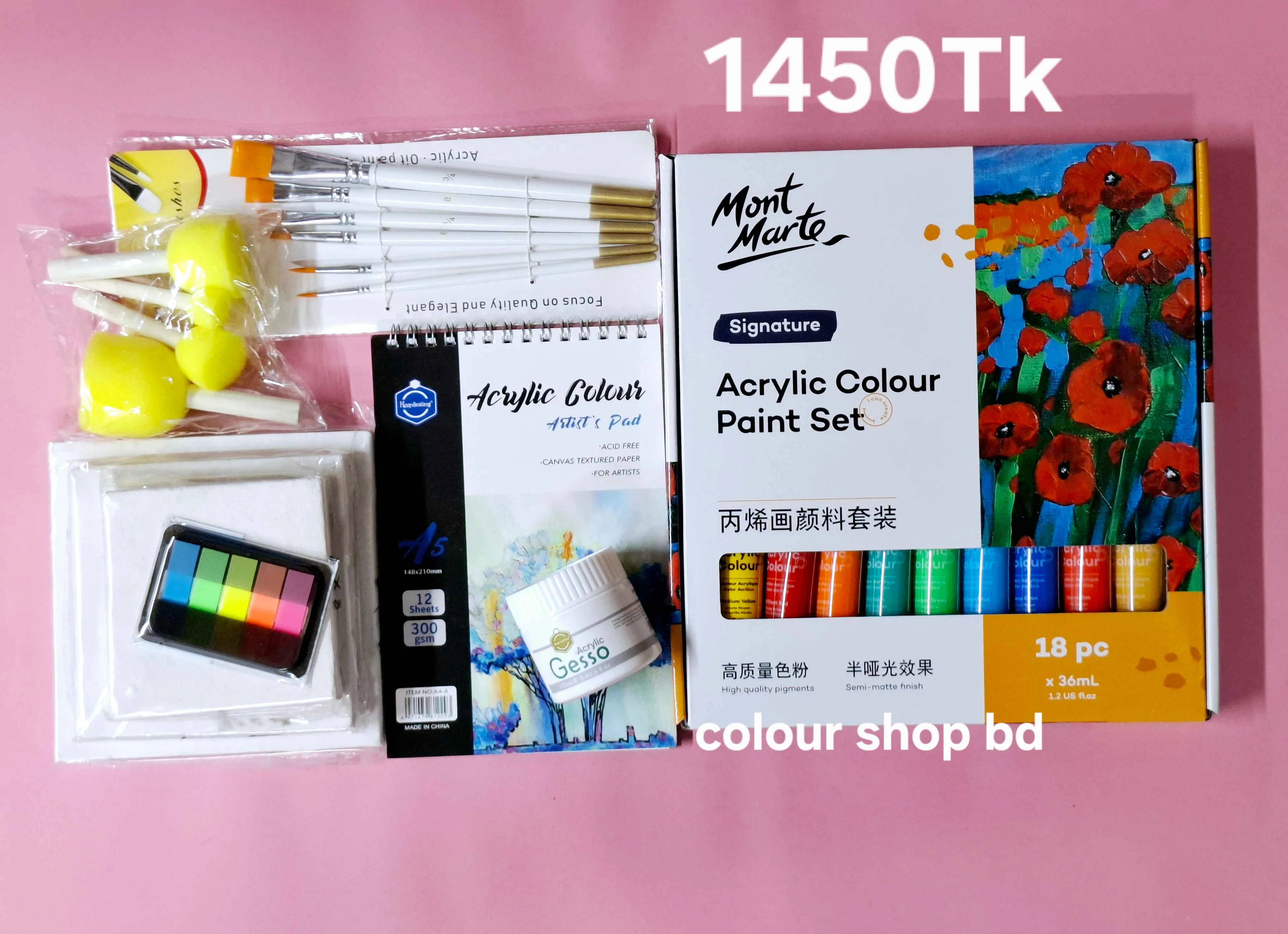 কম্বো সেট Mont mart 18colour 36ml..1set 6pca brush 1 set Gesso.100ml..1pcs foam brush 5pcs 1set A5size acrylic pad 1pcs Canvas 4/4..1pcs..5/5..1pcs 6/6..1pcs stick a note.. 1set