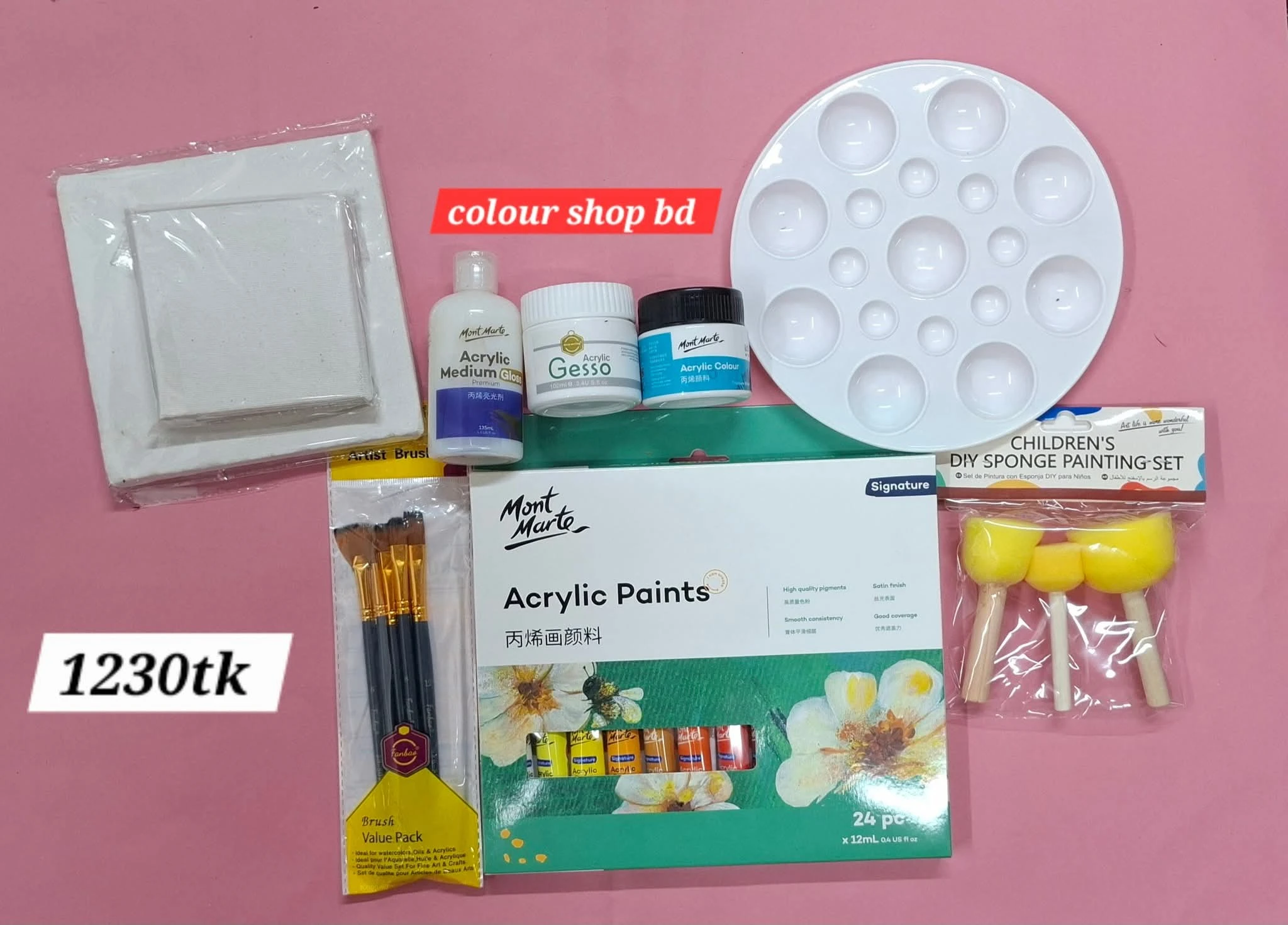 1.Mont marta acrylic colour 24pcs 12ml 2. brush 7pcs set 3.vanish 135ml 4.canvas.. 4/4..5/5 5.gesso.100ml 6.white colour 100ml 7.foam brush set 8.round colour plate https://colourshopbd.com/